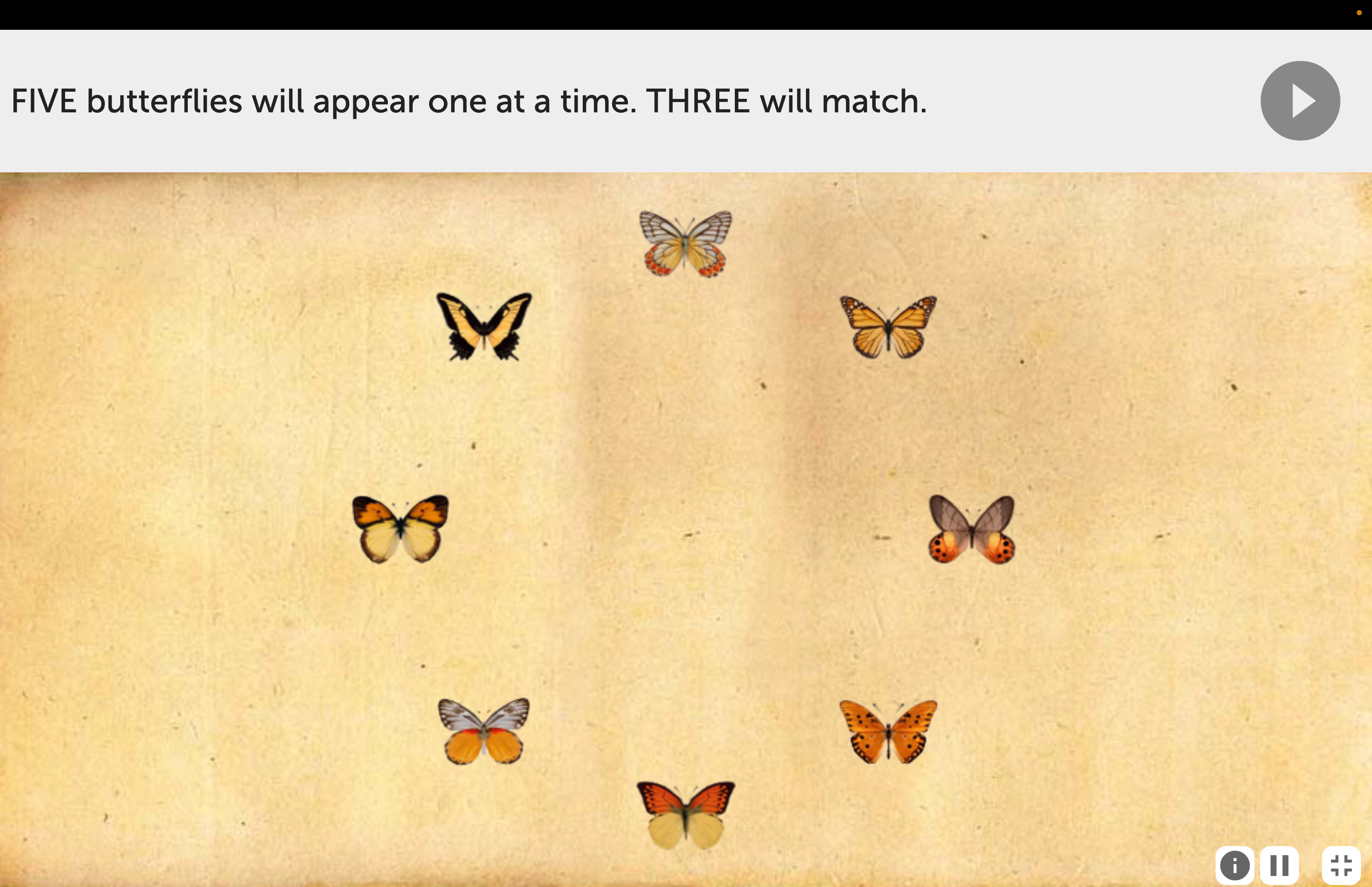 The researchers used two games from BrainHQ.com called Double Decision and Freeze Frame. You can play a sample game by going to the website, scrolling down to the area called “Try A Few Exercises,” and hit start on the screen just below. (To make playing easier, enlarge the game window first, so it fills your screen.) The butterfly-filled screen at the top of this article is from that sample game.