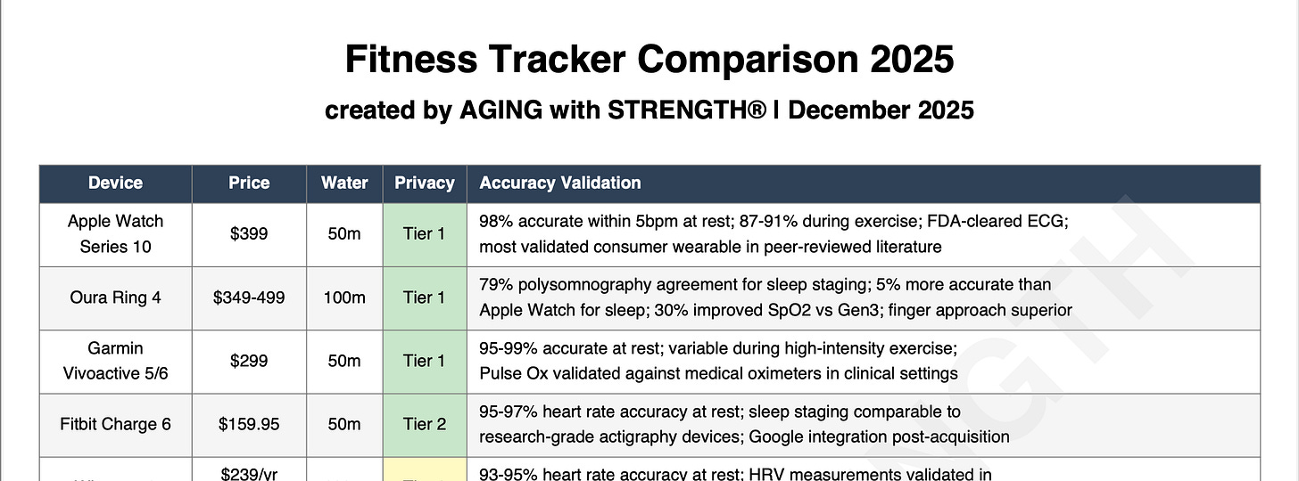 The 4-page PDF below, containing a series of charts, covers all the information I mentioned in the above bullet points and presents fitness tracker information you can’t find in one place anywhere else. (NOTE: I used an upper-echelon, paid version of Claude.ai to research and compile this data…and spent several hours vetting it.)