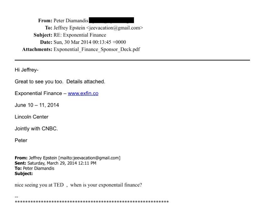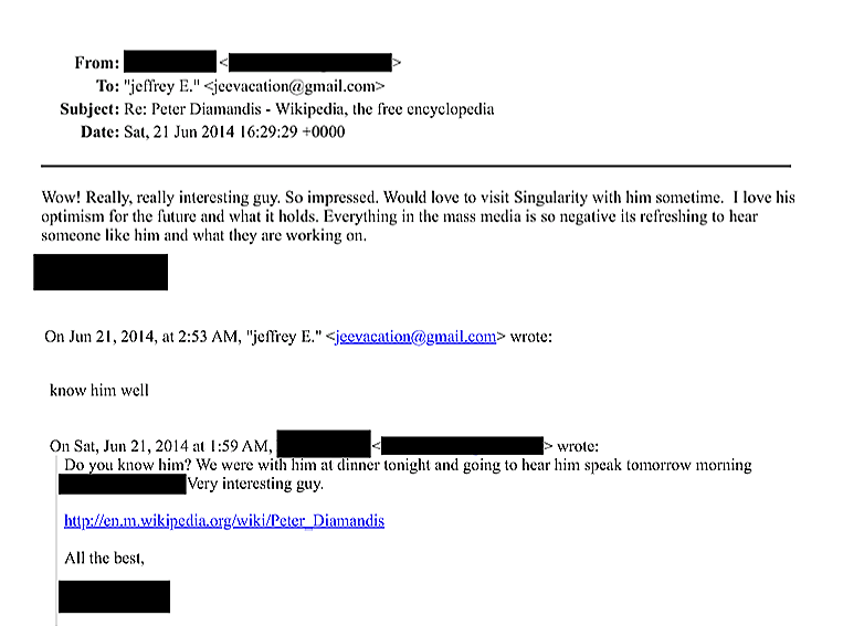 “Hi Jeffrey- It’s been a while since we chatted,” Diamandis wrote. “I’d love to connect and catch-up,” he added. “Are you in NYC or Florida these days?”