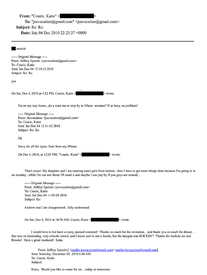 So did Bryan Johnson, the wax-skinned tech bro who wants people to pay him $1 million to avoid death. So did Katie Couric, who attended (now arrested former) Prince Andrew’s birthday party—and rearranged weekend plans to have tea at Epstein’s New York City home—17 months after he was released from prison. So did Deepak Chopra, who met with Epstein at least 12 times between 2016 and late 2018, during which time Chopra published two NYT best-selling self-help books, including “The Healing Self: A Revolutionary New Plan to Supercharge Your Immunity and Stay Well for Life.” So did George Church, a Harvard genetics professor and longevity business entrepreneur who, along with two Harvard colleagues, once proposed Epstein fund a “pleasure genome initiative” exploring neural correlates of pleasure, and who shared meals with Epstein as late as 2014.