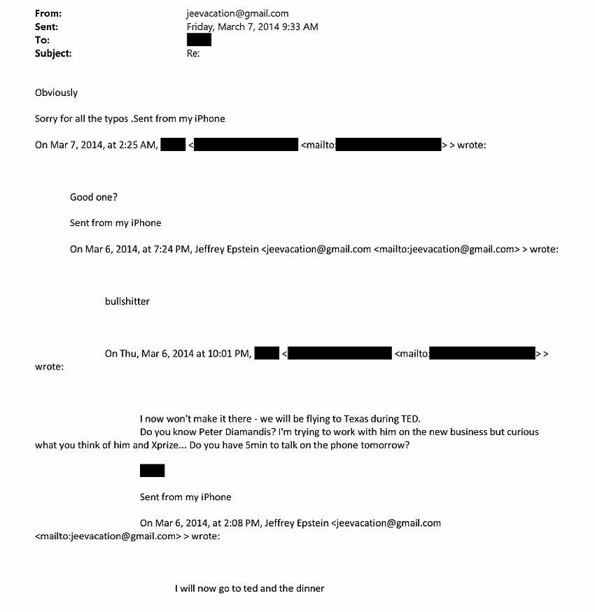 In an email sent a couple weeks before meeting Diamandis at a TED conference and three months before the two men arranged to meet in New York, Epstein referred to Diamandis as a “bullshitter.”