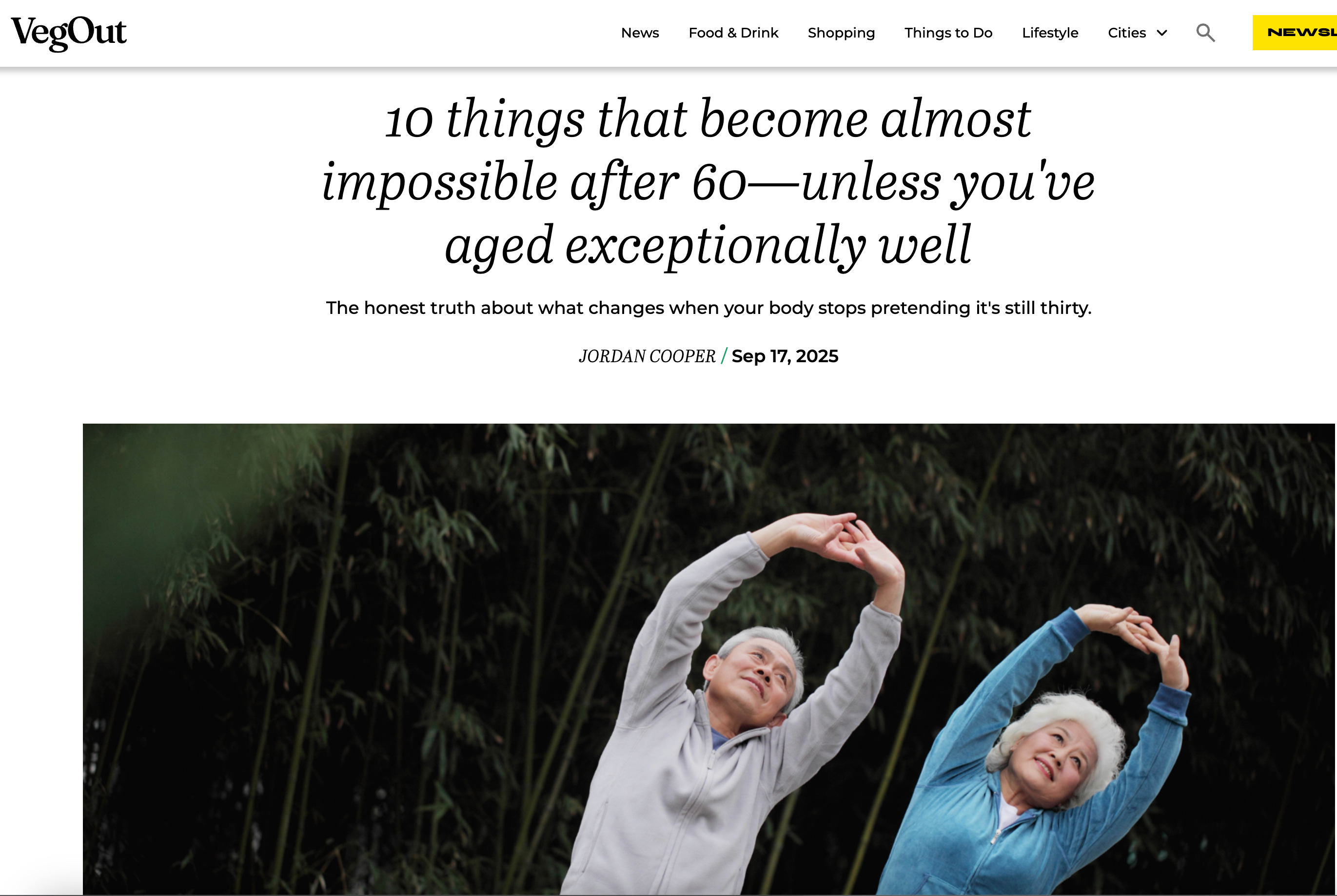 Clever would have required either a) the author to have done basic reporting on what actually becomes extraordinarily difficult around age 60, or b) VegOut’s crack team of newsroom leaders to have found a credible voice to artfully mock what this piece calls “toxic positivity about aging.”